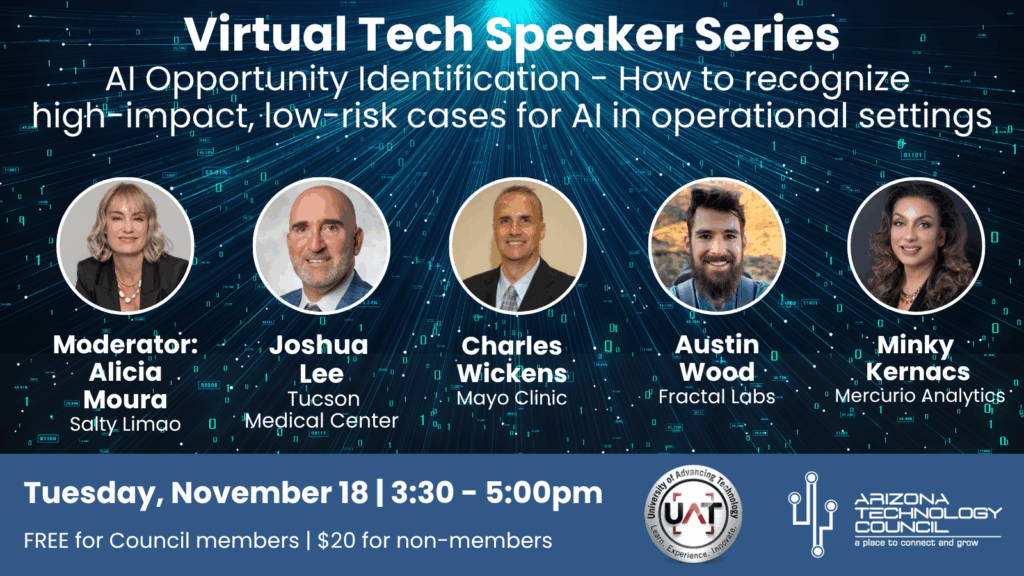 Join us for the second session in a four-part Virtual Tech Speaker Series hosted by the Arizona Technology Council’s AI Committee – AI Opportunity Identification – How to recognize high-impact, low-risk cases for AI in operational settings.